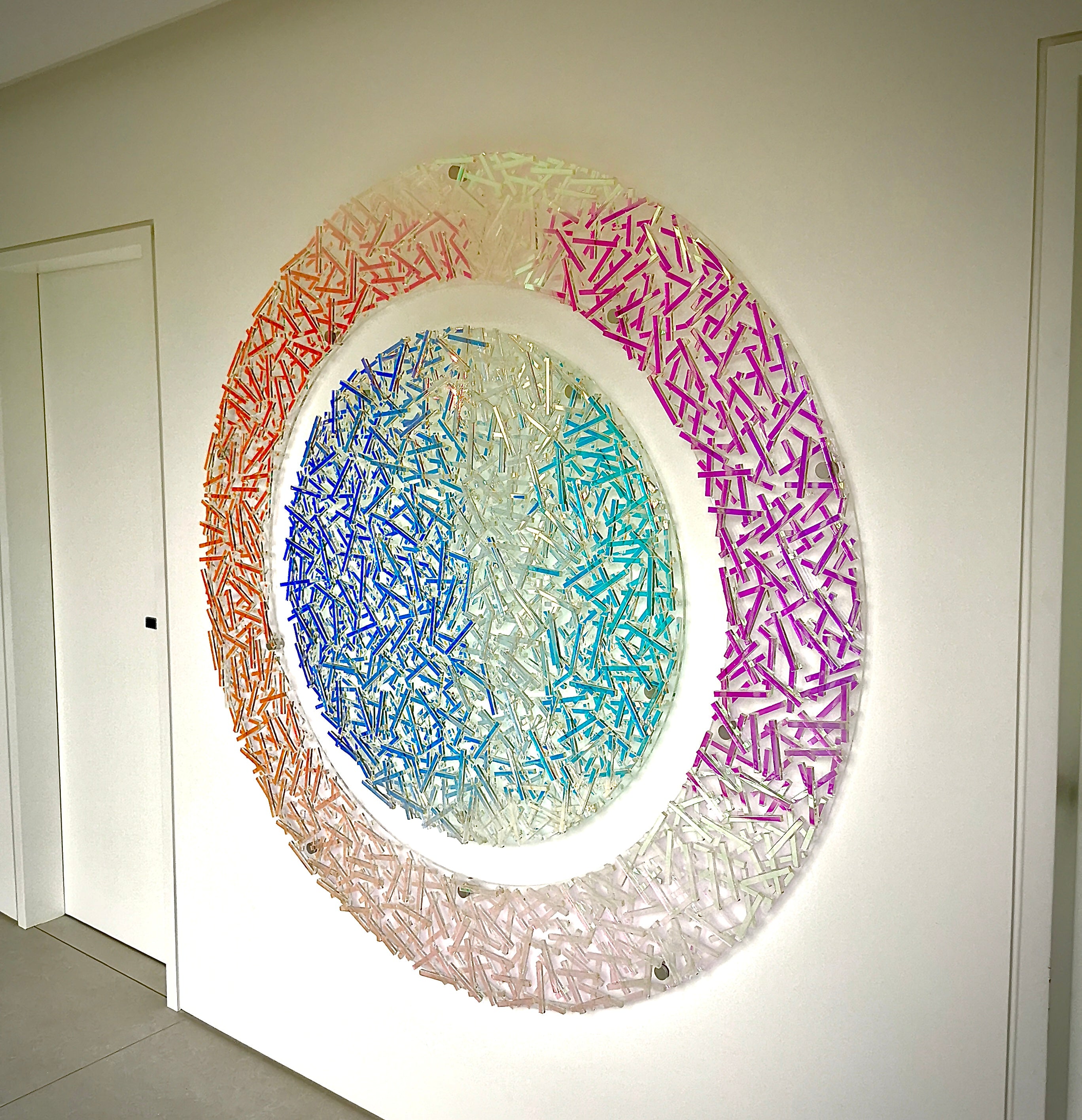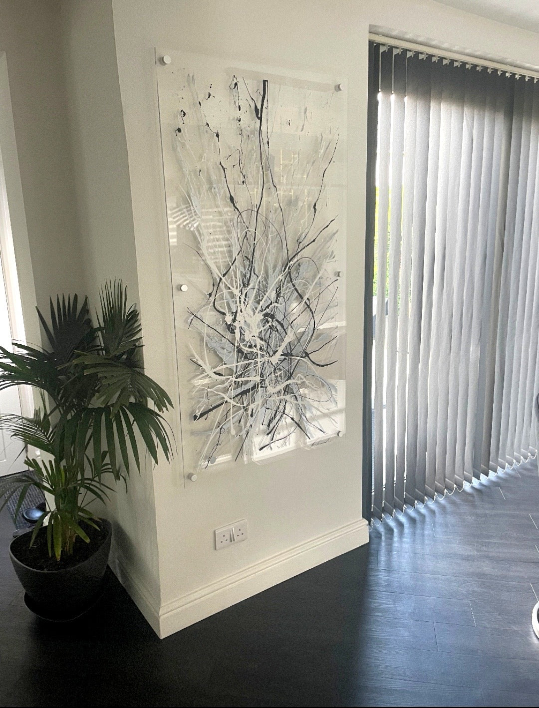 It all started with the desire to produce a bright and colourful piece of art for my own home; Since then I have explored creative avenues, with effective results, by combining different mediums in my pieces such as vinyl, florescent acrylic, iridescent films and many more.
